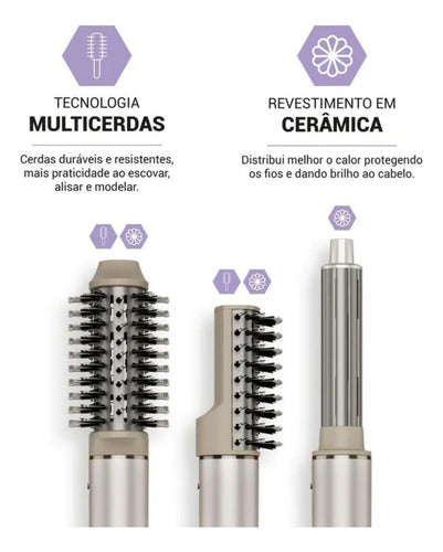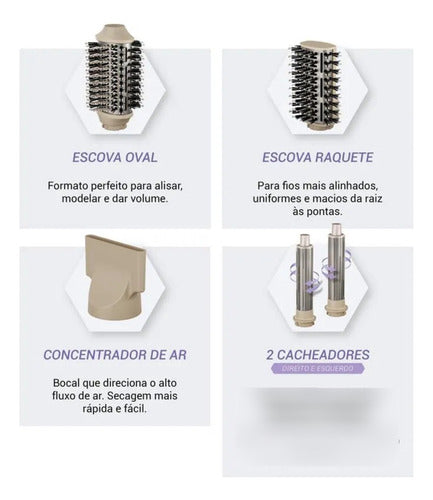 - 4 em 1: acompanha acessórios que deixam ele um produto multifuncional - concentrador de ar, cacheadores, escova oval e escova raquete